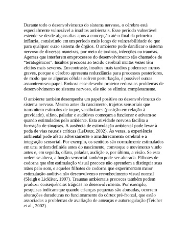 (Sleigh e Lickliter, 1997). Traumas ambientais precoces também podem