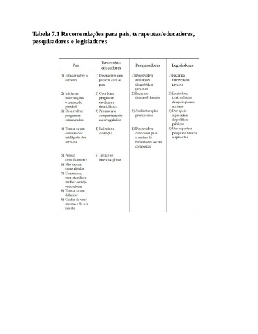 Tabela 7.1 Recomendações para pais, terapeutas/educadores, pesquisadores e legisladores