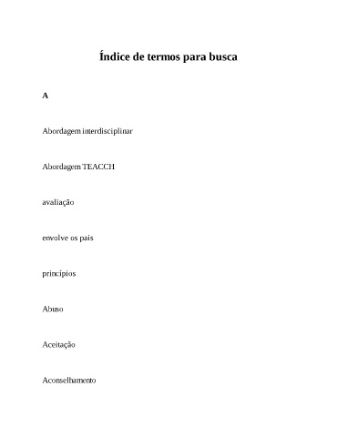 Índice de termos para busca A Abordagem interdisciplinar Abordagem TEACCH avaliação envolve os pais princípios Abuso Aceitação Aconselhamento