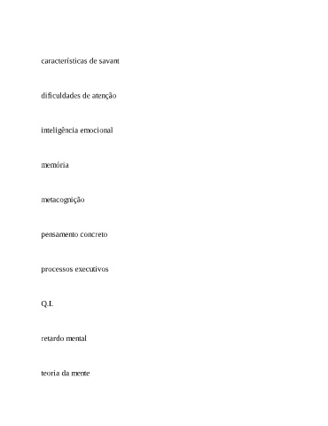 características de savant dificuldades de atenção inteligência emocional memória metacognição pensamento concreto processos executivos Q.I. retardo mental teoria da mente