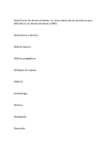Deficiências do desenvolvimento, lei norte-americana de assistência para deficiências do desenvolvimento (1990) Deficiências e direitos Déficits básicos Déficits pragmáticos Definição de autismo DSM-lV terminologia Delírios Demografia Depressão
