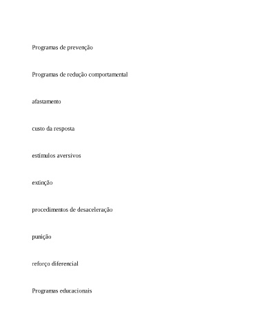 Programas de prevenção Programas de redução comportamental afastamento custo da resposta estímulos aversivos extinção procedimentos de desaceleração punição reforço diferencial Programas educacionais