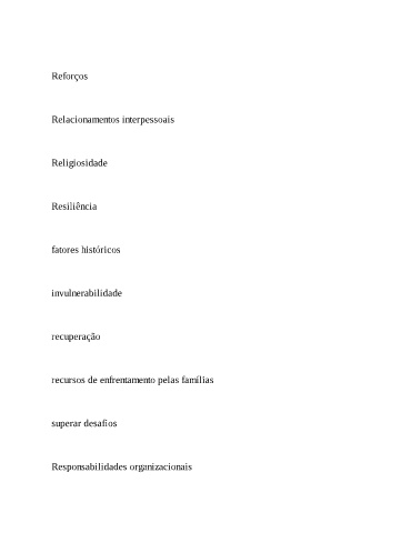Reforços Relacionamentos interpessoais Religiosidade Resiliência fatores históricos invulnerabilidade recuperação recursos de enfrentamento pelas famílias superar desafios Responsabilidades organizacionais