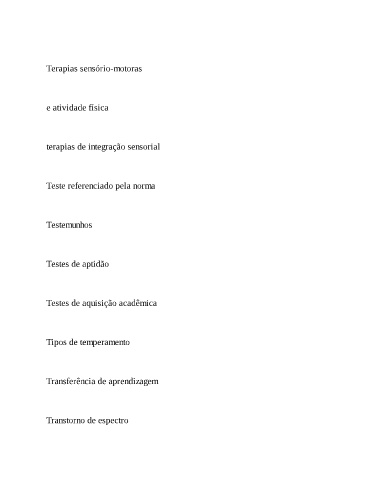Terapias sensório-motoras e atividade física terapias de integração sensorial Teste referenciado pela norma Testemunhos Testes de aptidão Testes de aquisição acadêmica Tipos de temperamento Transferência de aprendizagem Transtorno de espectro